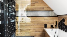 Dans cette grande salle de bain, nos clients désiraient également créer une toilette fermée et couper l’accès direct à leur chambre créant ainsi, une grande salle d’eau indépendante pour toute la famille.