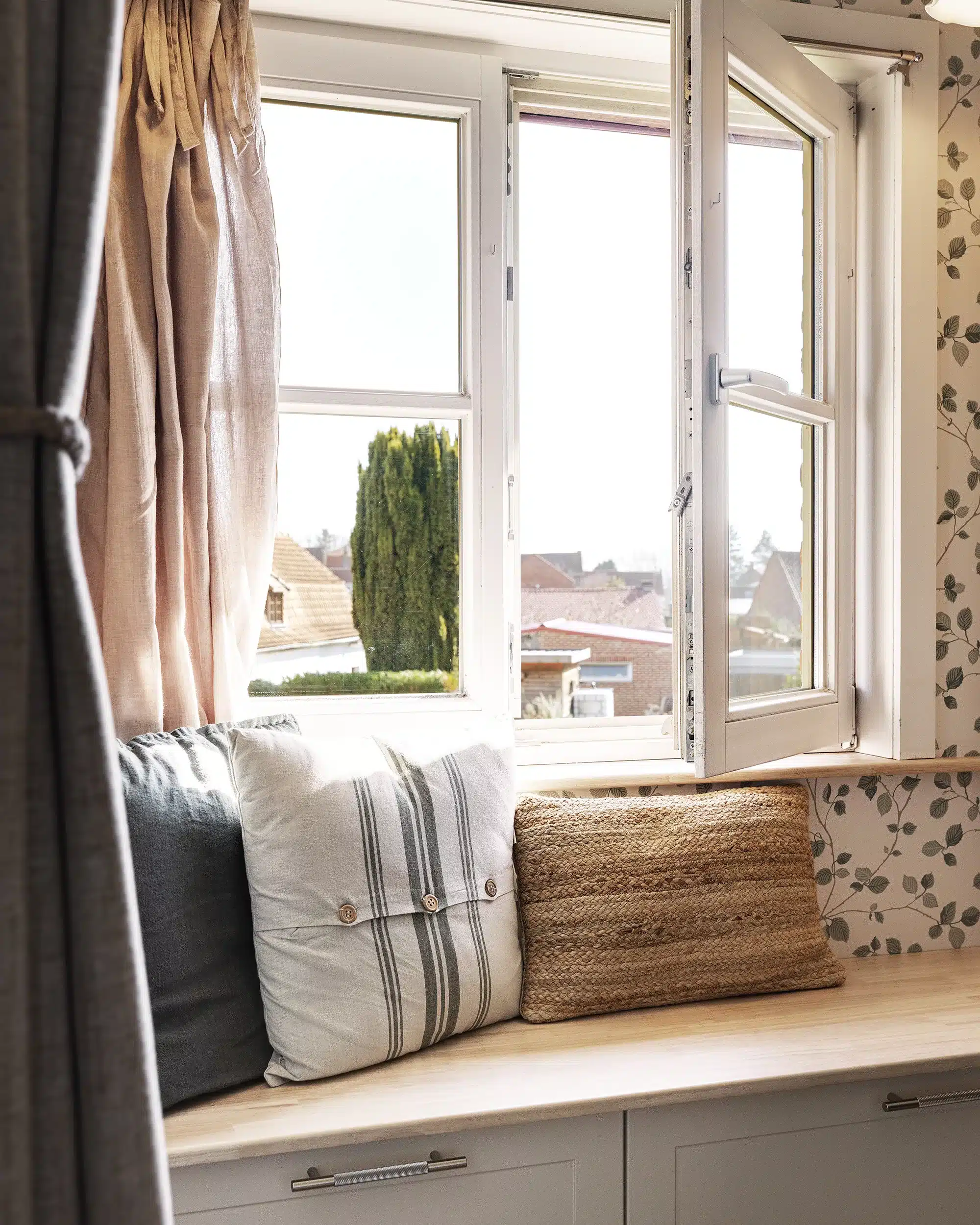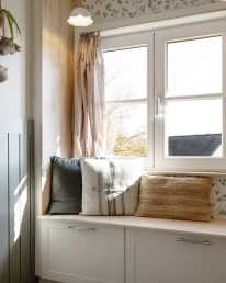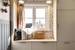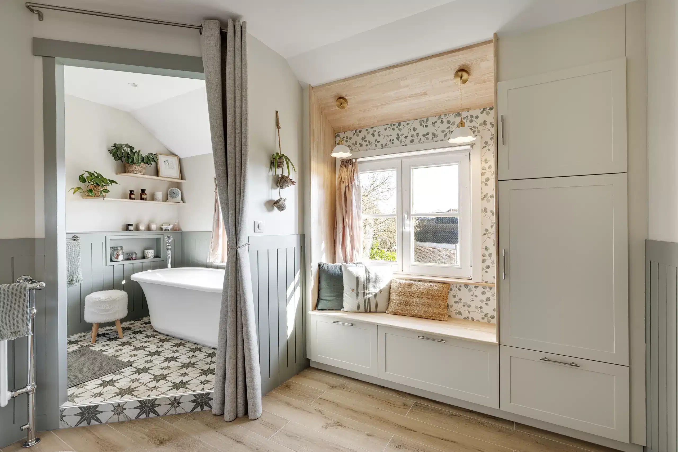 Le premier accueille le nouveau meuble vasque ainsi qu’une banquette de rangement réalisée en semi-mesure. Le second regroupe la douche et la baignoire, un espace pouvant être dissimulé par un rideau épais. Chaque zone conserve sa propre fenêtre, garantissant ainsi une diffusion optimale de la lumière naturelle.