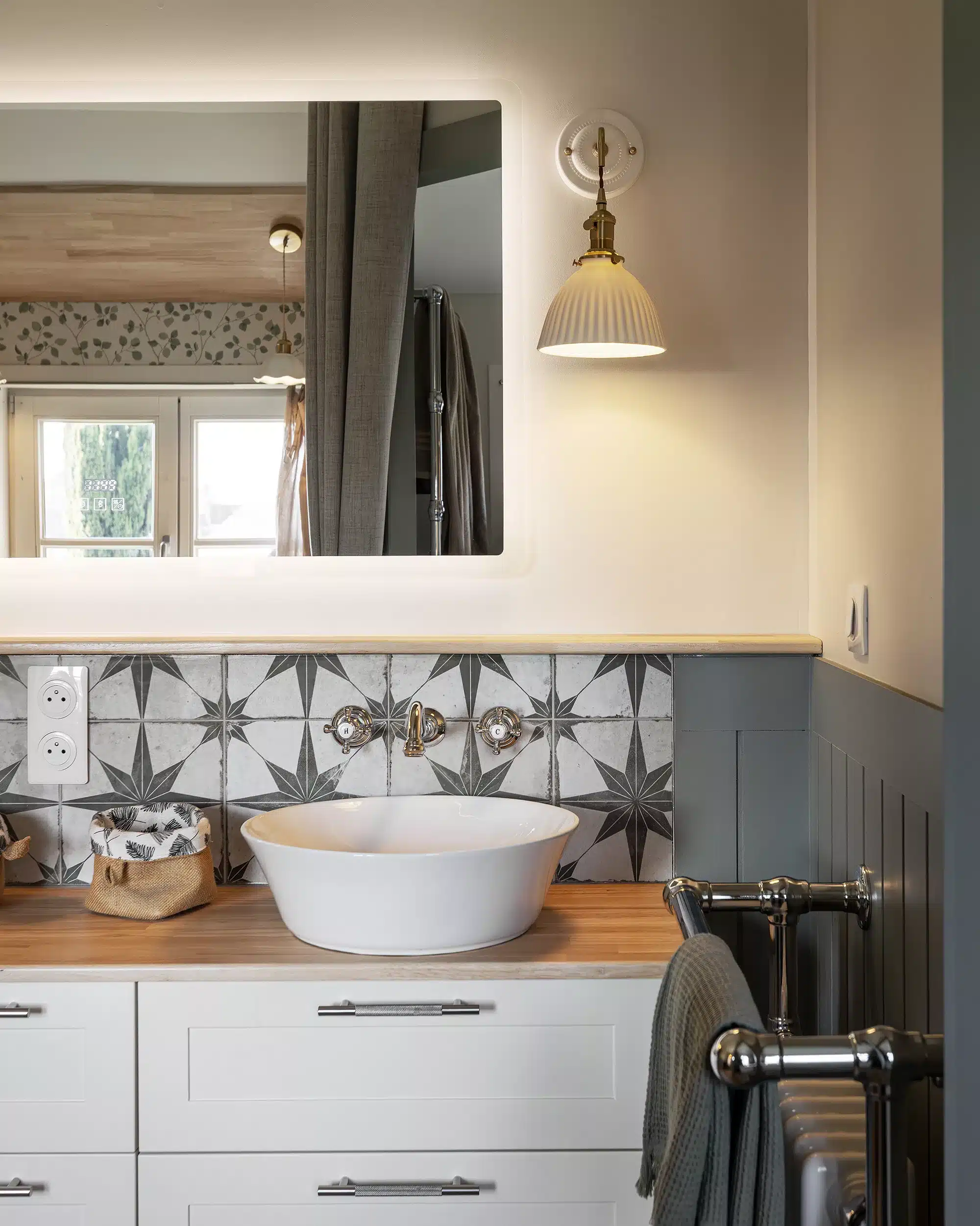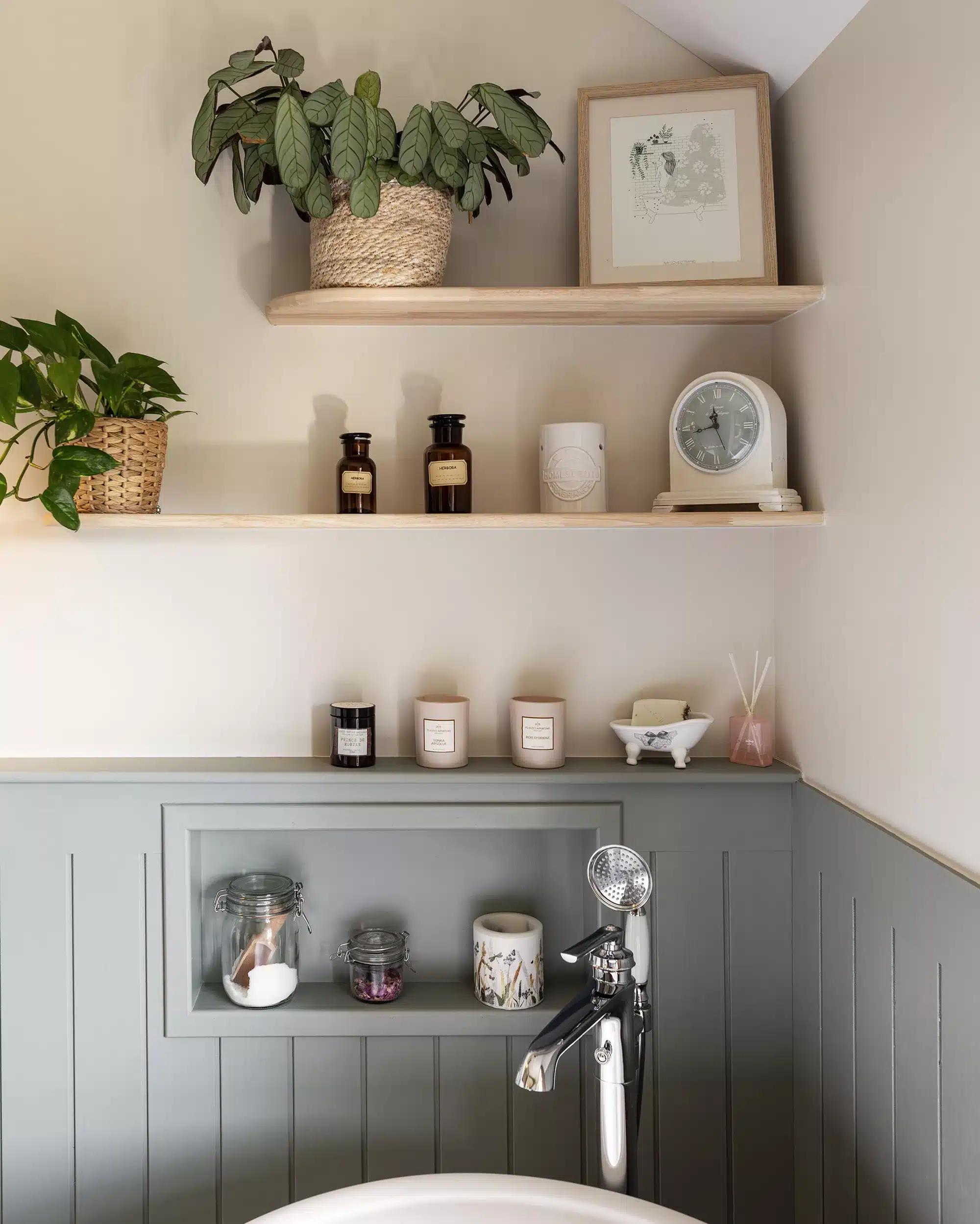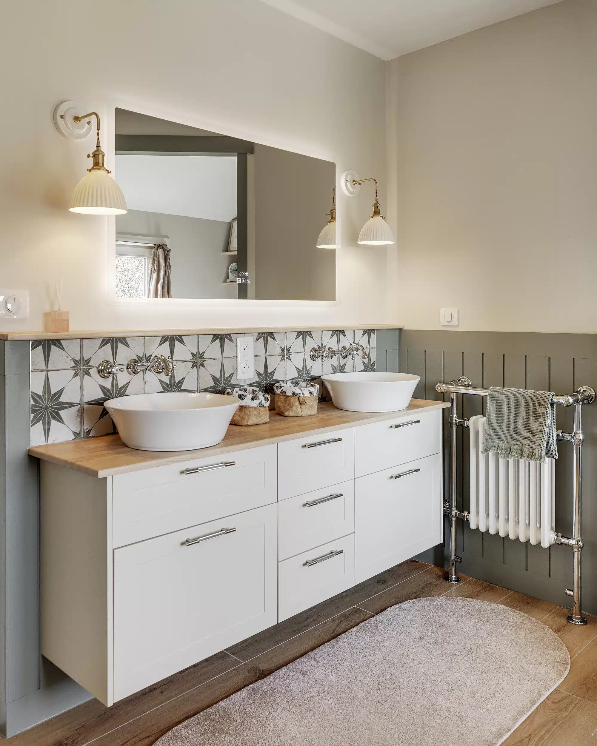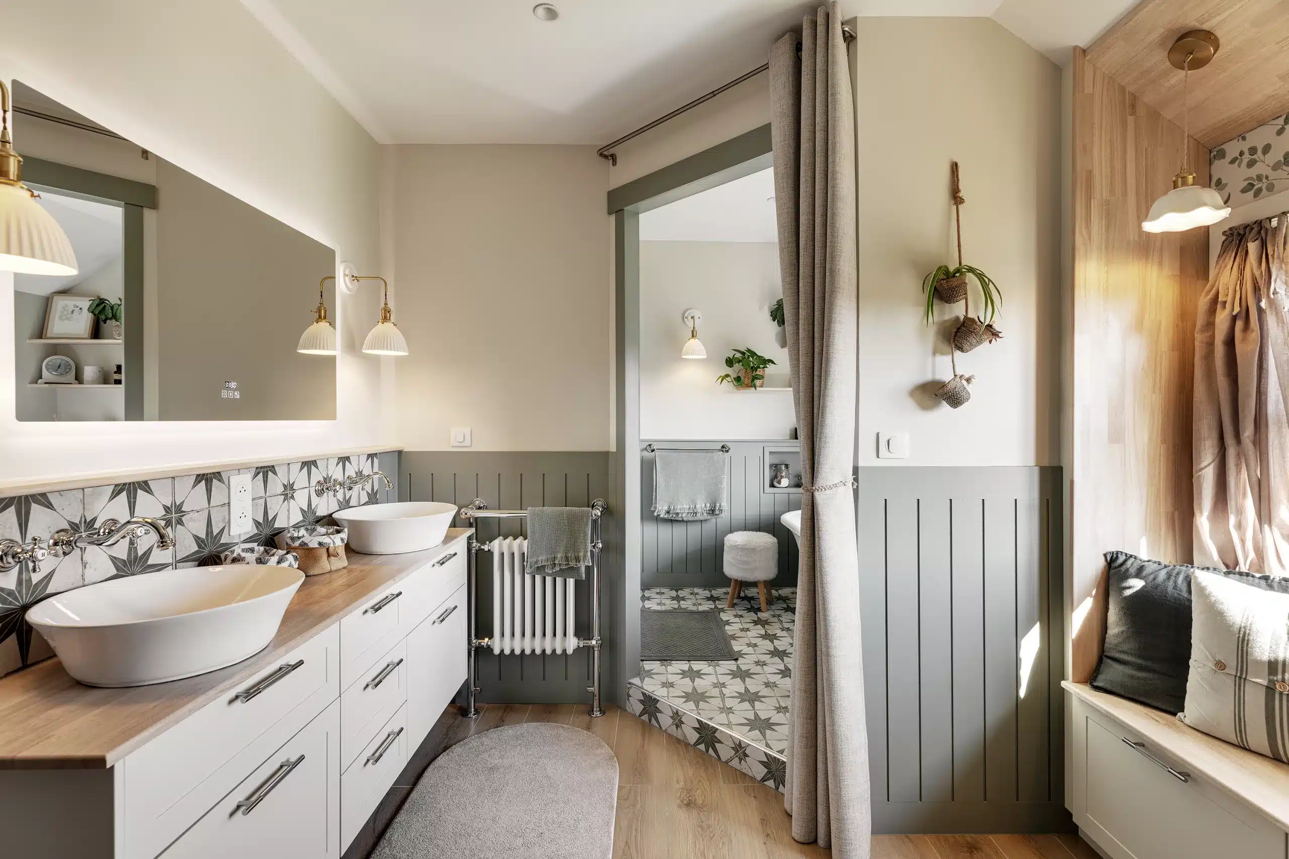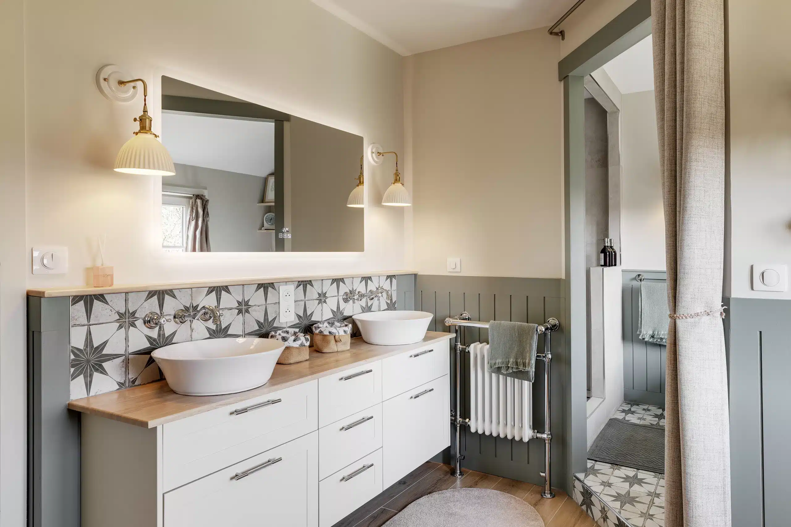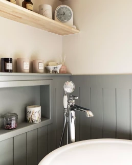 Un autre point essentiel du projet consistait à respecter l’esprit cottage cher à notre cliente. Pour traduire ce style anglais, nous avons imaginé un soubassement rainuré courant sur l’ensemble de la salle de bain, associé à une robinetterie à l’esthétique ancienne et à des façades à cadres moulurés. Une peinture feutrée, dans un vert gris patiné, vient réchauffer l’espace et mettre en valeur ce soubassement. Elle est équilibrée par un beige chaud qui confère à la pièce une atmosphère intemporelle, comme si la salle de bain avait toujours existé, malgré sa réalisation récente. L’ensemble est sublimé par des objets chinés et authentiques.