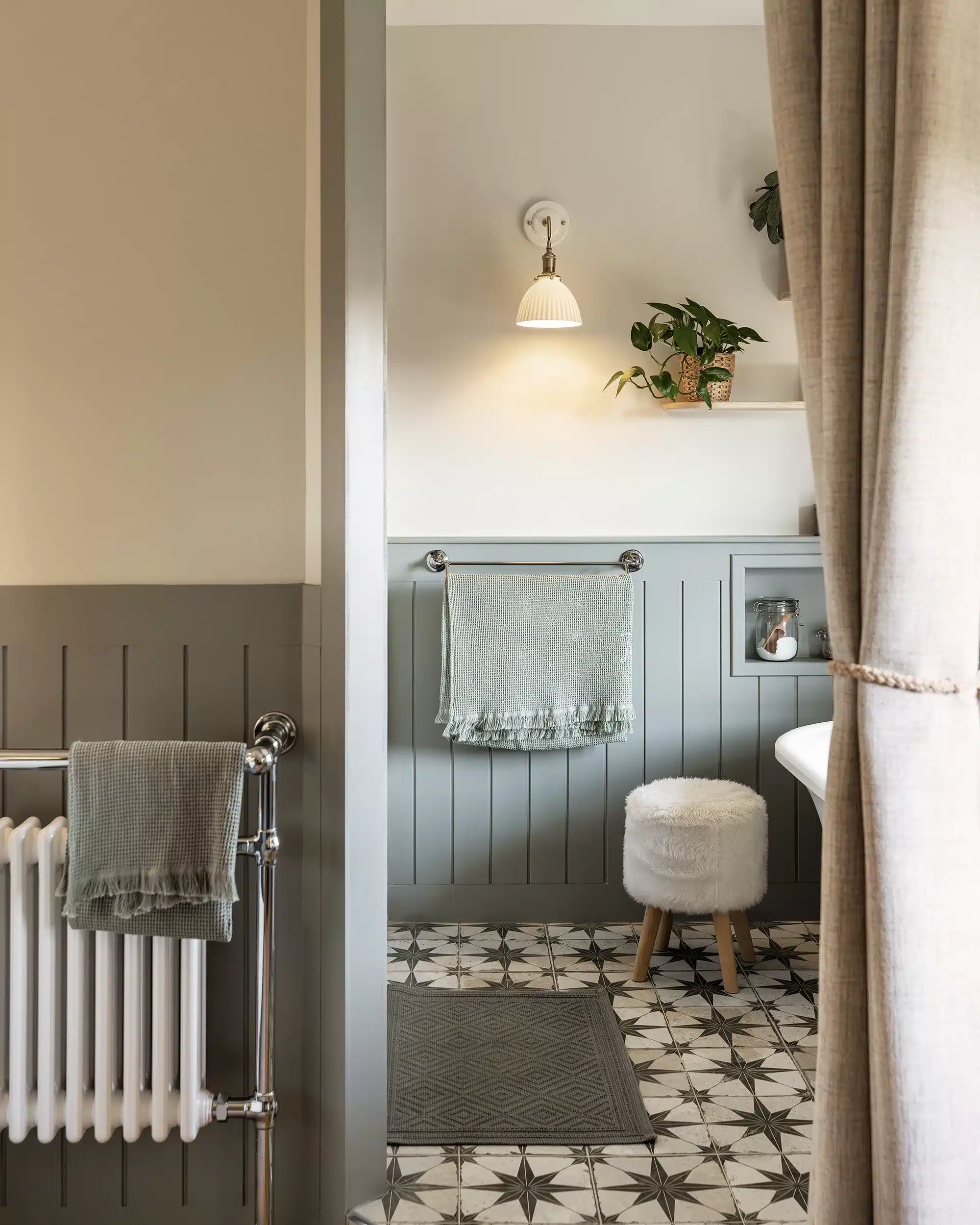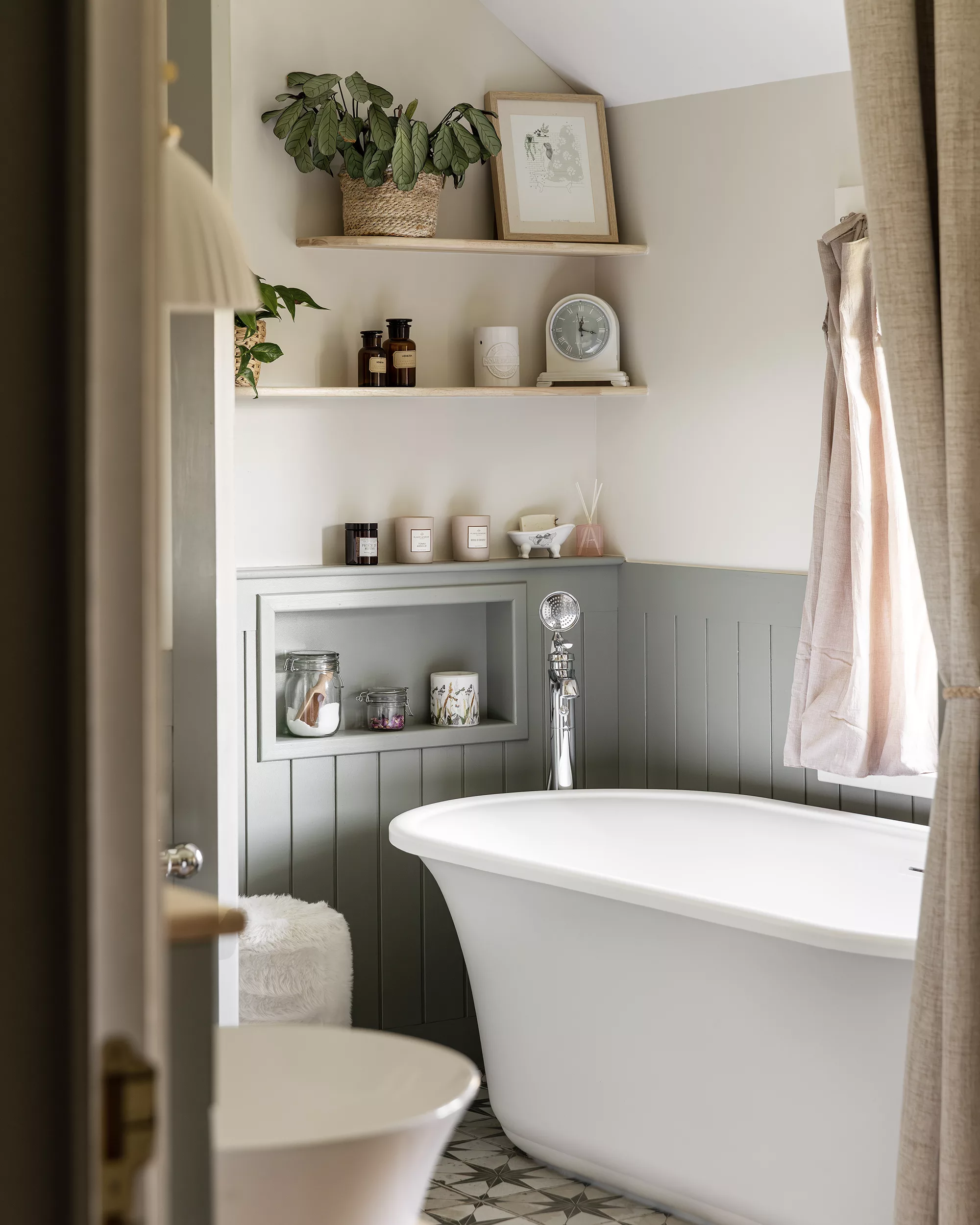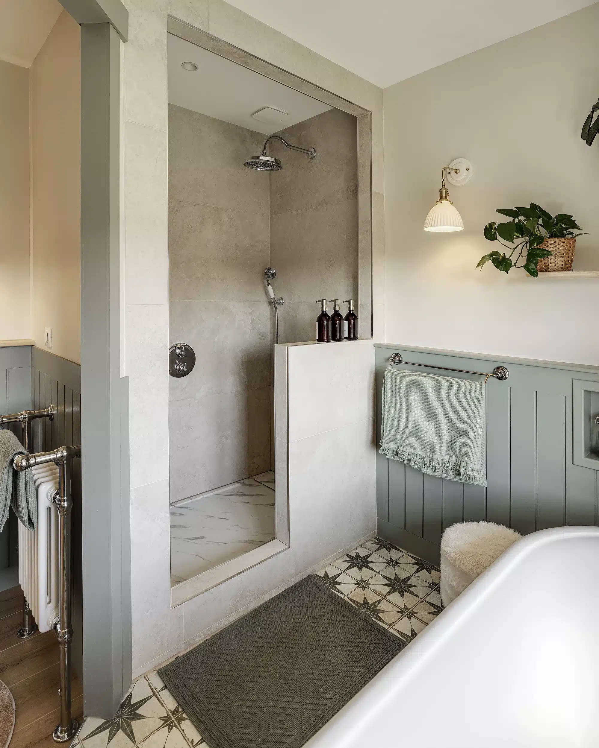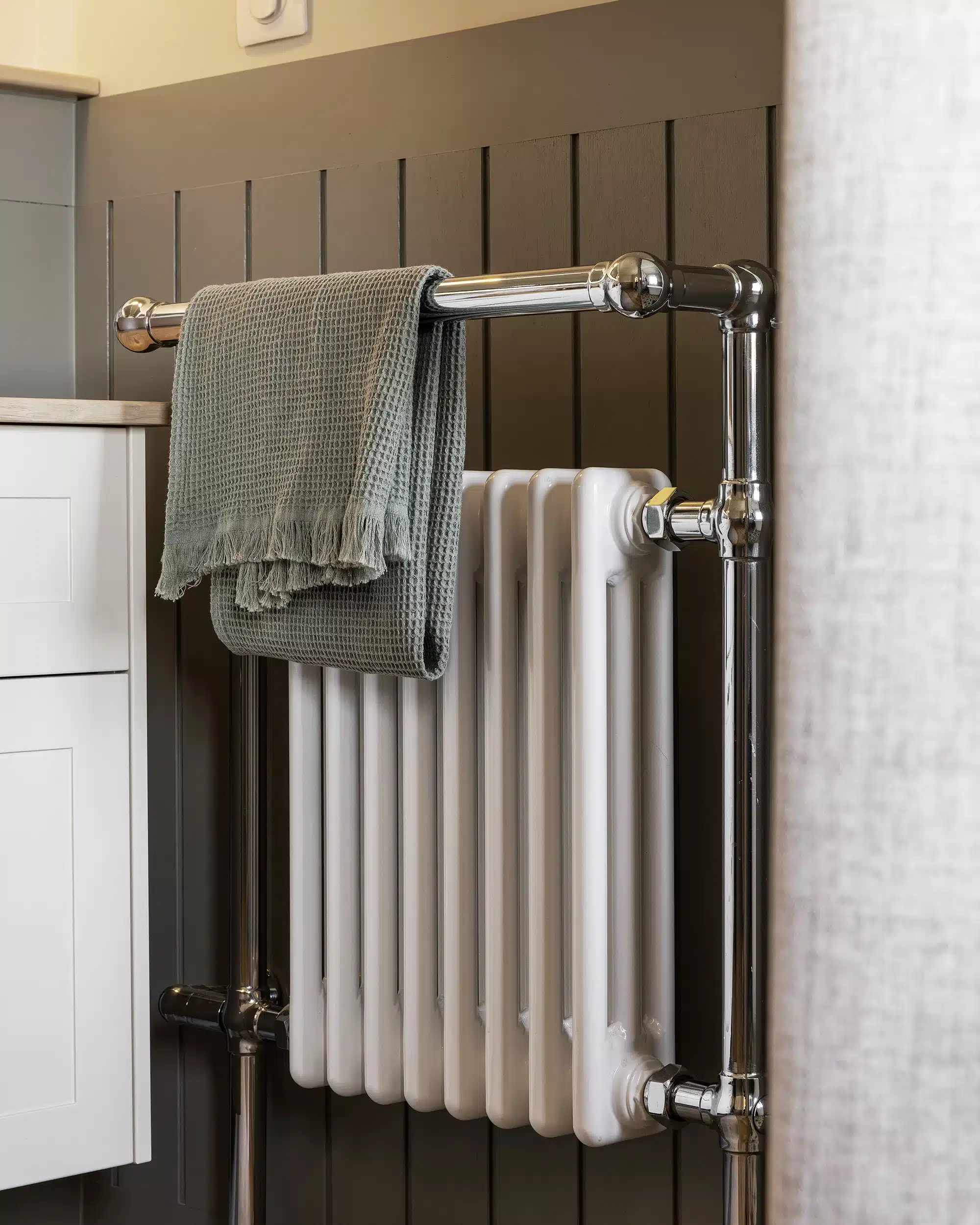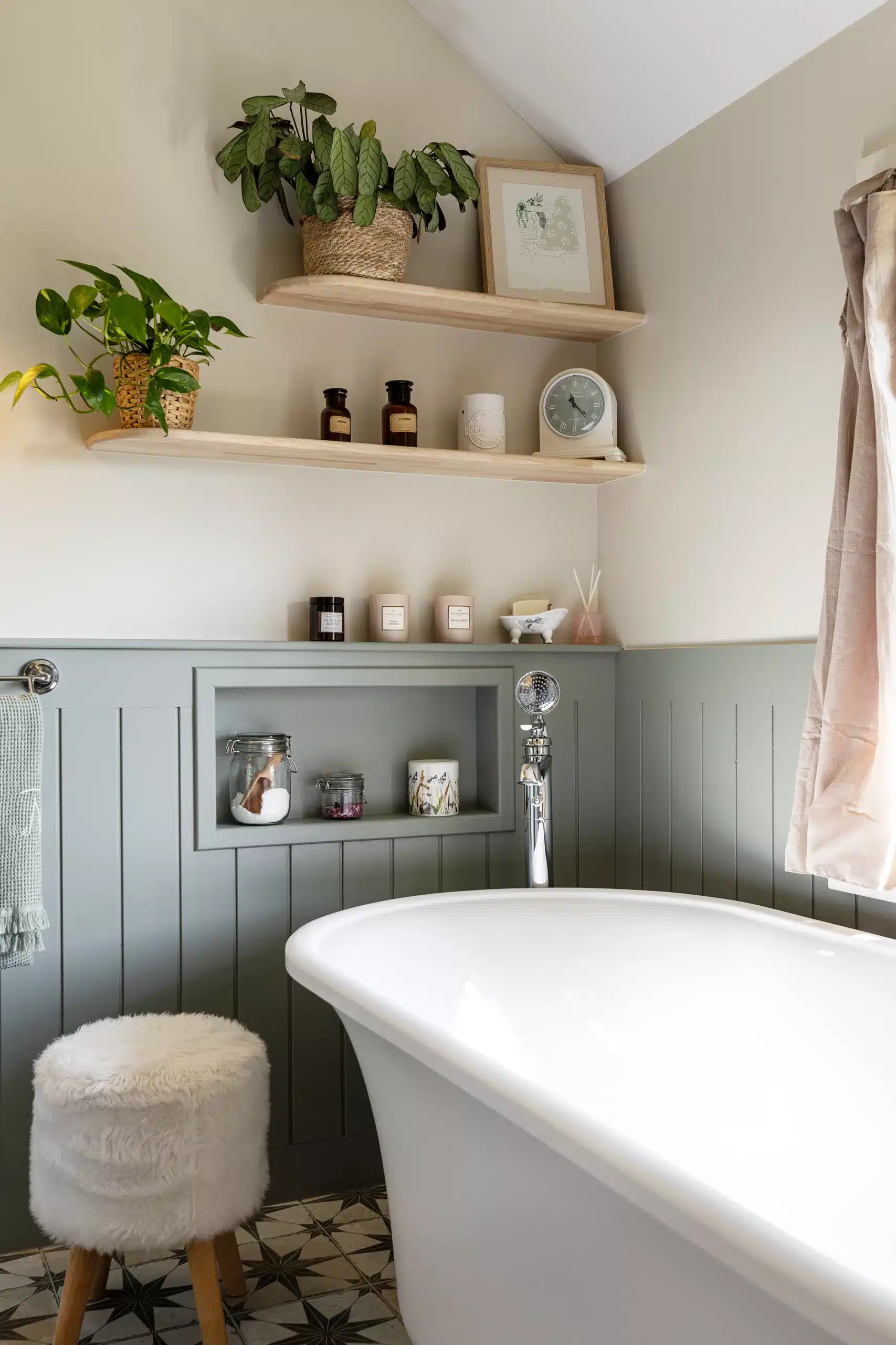 Un autre point essentiel du projet consistait à respecter l’esprit cottage cher à notre cliente. Pour traduire ce style anglais, nous avons imaginé un soubassement rainuré courant sur l’ensemble de la salle de bain, associé à une robinetterie à l’esthétique ancienne et à des façades à cadres moulurés. Une peinture feutrée, dans un vert gris patiné, vient réchauffer l’espace et mettre en valeur ce soubassement. Elle est équilibrée par un beige chaud qui confère à la pièce une atmosphère intemporelle, comme si la salle de bain avait toujours existé, malgré sa réalisation récente. L’ensemble est sublimé par des objets chinés et authentiques.