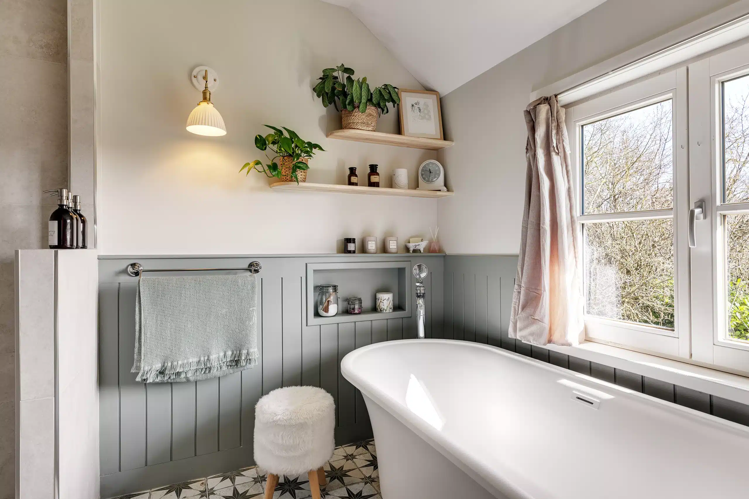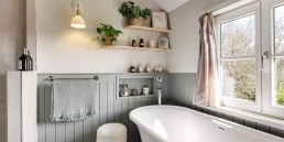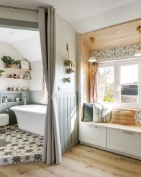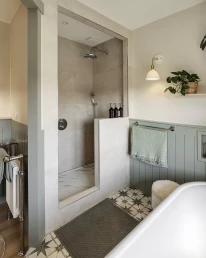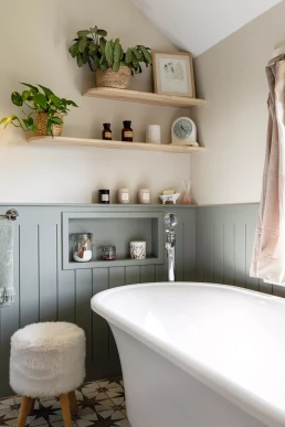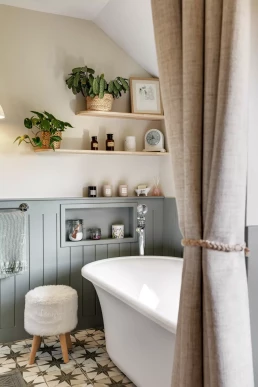 Elle souhaitait également intégrer une grande baignoire îlot ainsi que des solutions de rangement optimisées, le tout dans un esprit cottage anglais.