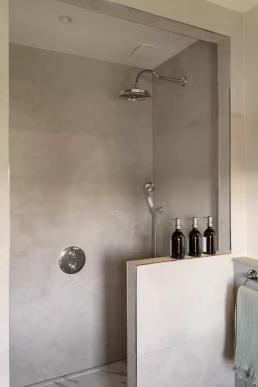 Afin de répondre au mieux à la demande initiale de notre cliente, préserver l’intimité de la zone d’eau, nous avons choisi de diviser la pièce en deux espaces distincts.