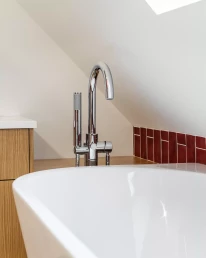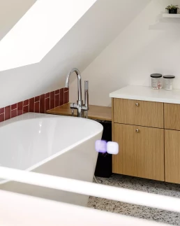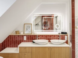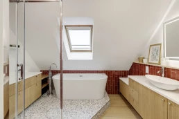 Nos clients rêvaient d’une baignoire îlot : ce souhait a pu être concrétisé grâce à la création d’une estrade technique surélevée, permettant le passage des réseaux et des alimentations de plomberie. Installée sur cette estrade, la nouvelle baignoire devient la pièce maîtresse de la salle de bain.