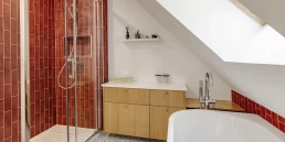 La douche à l’italienne et la baignoire ont été conservées, avec l’ajout de rangements complémentaires et la création d’une véritable identité visuelle pour cette salle de bain.