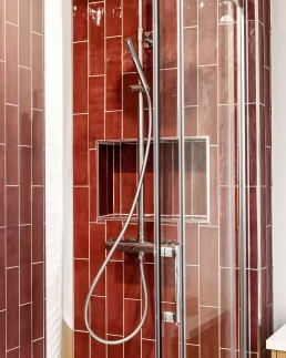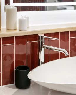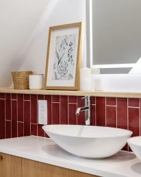 Une faïence en zellige bordeaux vient rythmer la décoration et poser le ton de ce nouvel espace. Associée à un carrelage effet terrazzo et à des meubles en finition chêne clair, cette combinaison offre un rendu à la fois tendance et actuel, tout en restant intemporel.