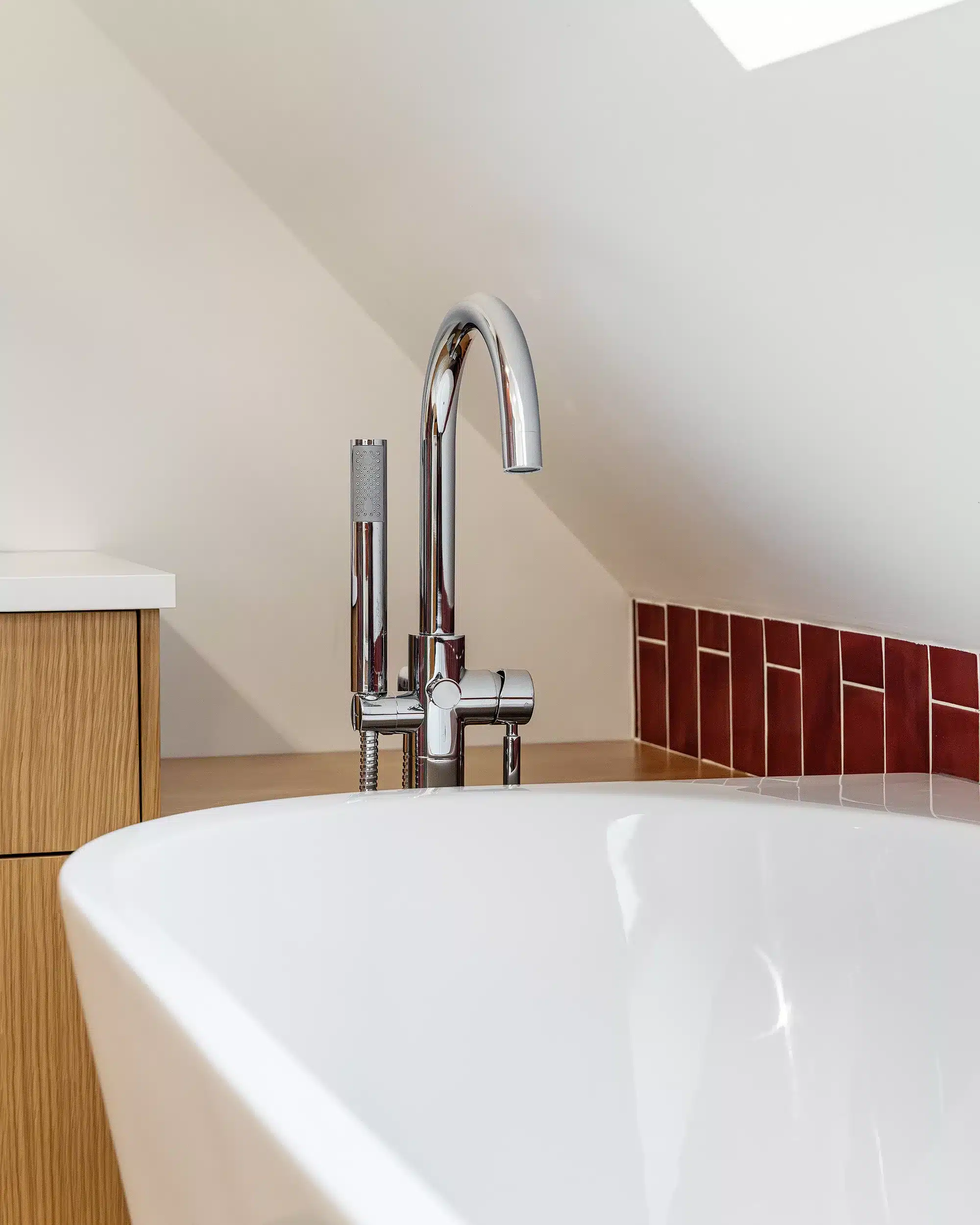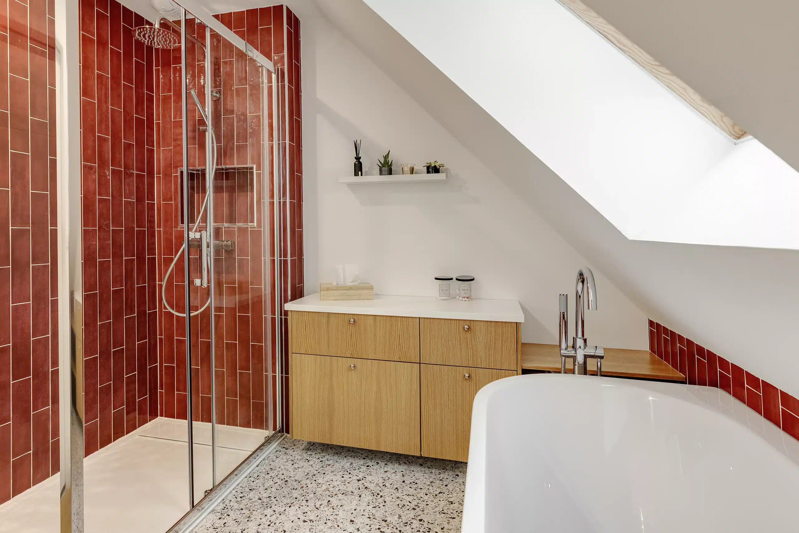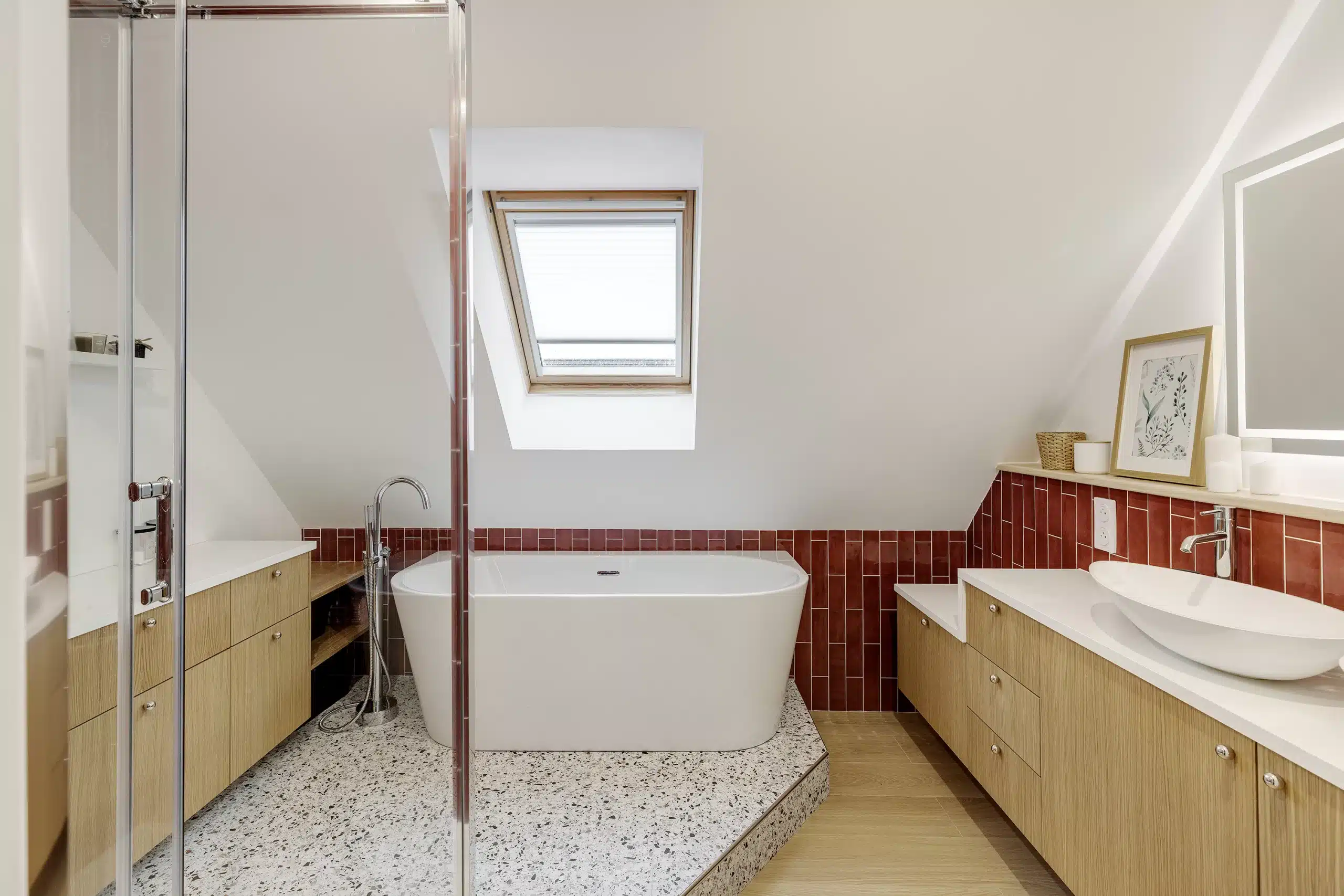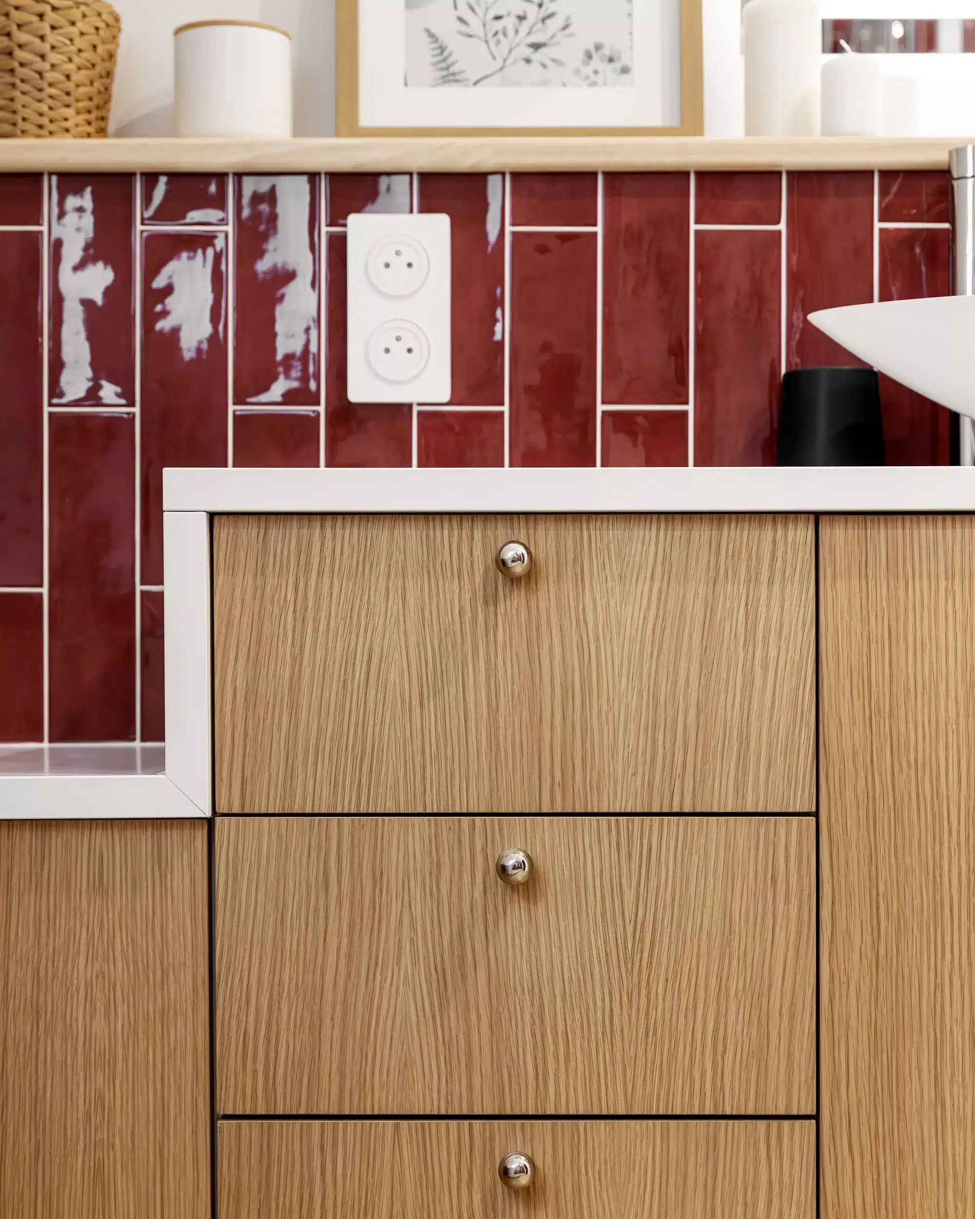 Une faïence en zellige bordeaux vient rythmer la décoration et poser le ton de ce nouvel espace. Associée à un carrelage effet terrazzo et à des meubles en finition chêne clair, cette combinaison offre un rendu à la fois tendance et actuel, tout en restant intemporel.
