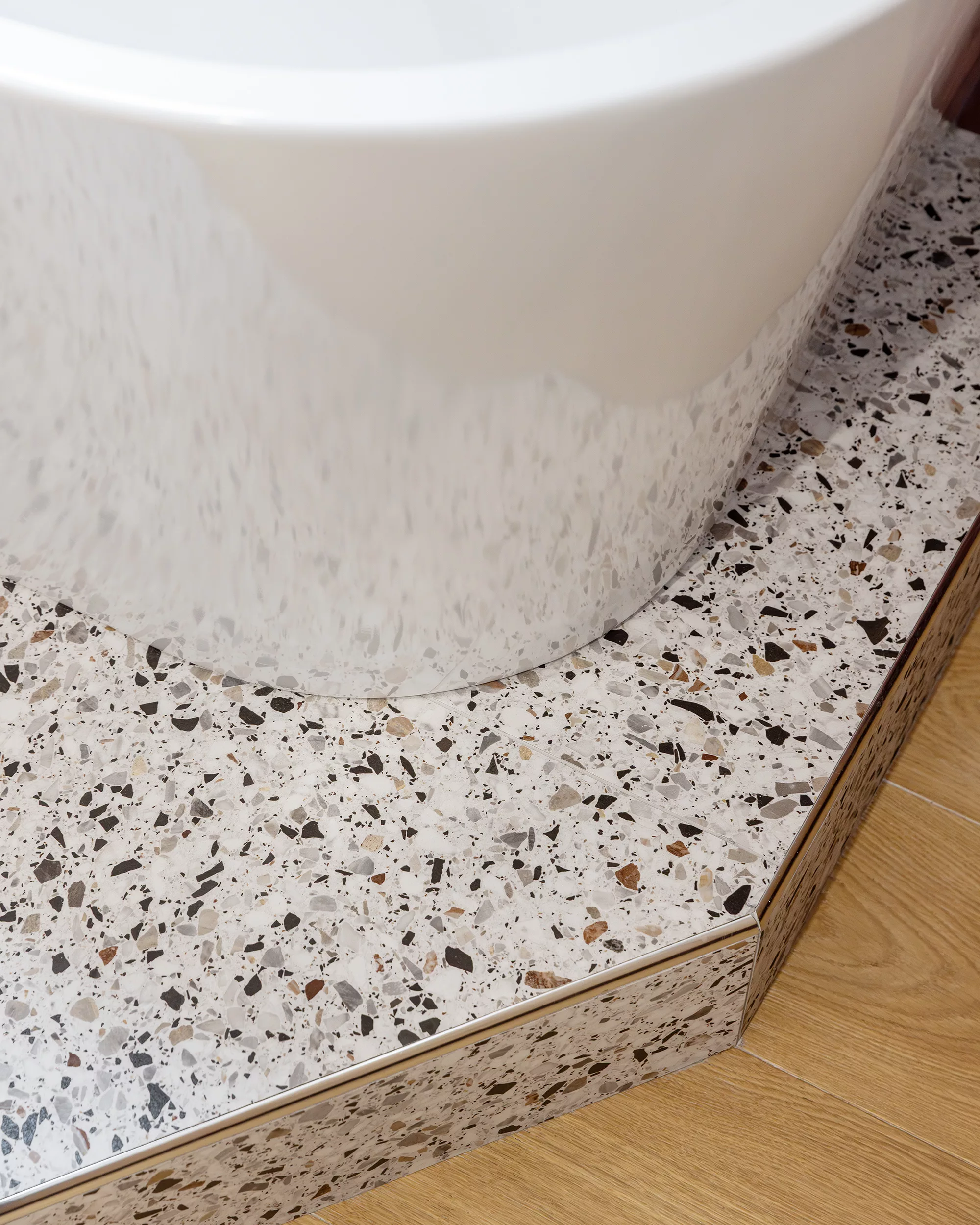 L’emplacement de la douche a été conservé, mais la circulation repensée : l’accès ne se fait désormais plus de face, mais latéralement grâce à une paroi de douche coulissante. Le nouveau parquet est ainsi sécurisé, tandis que toutes les zones exposées aux éclaboussures (douche / baignoire) restent traitées en carrelage effet terrazzo.